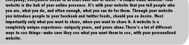 Welcome to your one stop shop for Webresentation. Whether you're looking to bring customers to your store, friends to your parties or clients to your services, we offer all the information that you need, and a lot of cool services of our own. Use our Webresent Calculator to help determine what kind of webresentation works best for you, then spend some time creating your online package. And if you need some help, rememeber there is always someone available to make sure you are properly Webresented !